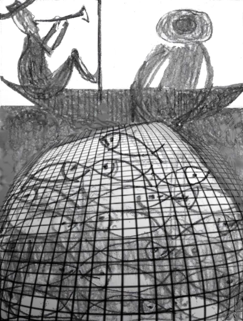 Dans la mer quadrillée d’un filet devenu monde, les poissons apparaissent comme révélés. Deux Bretons regardent l’horizon.